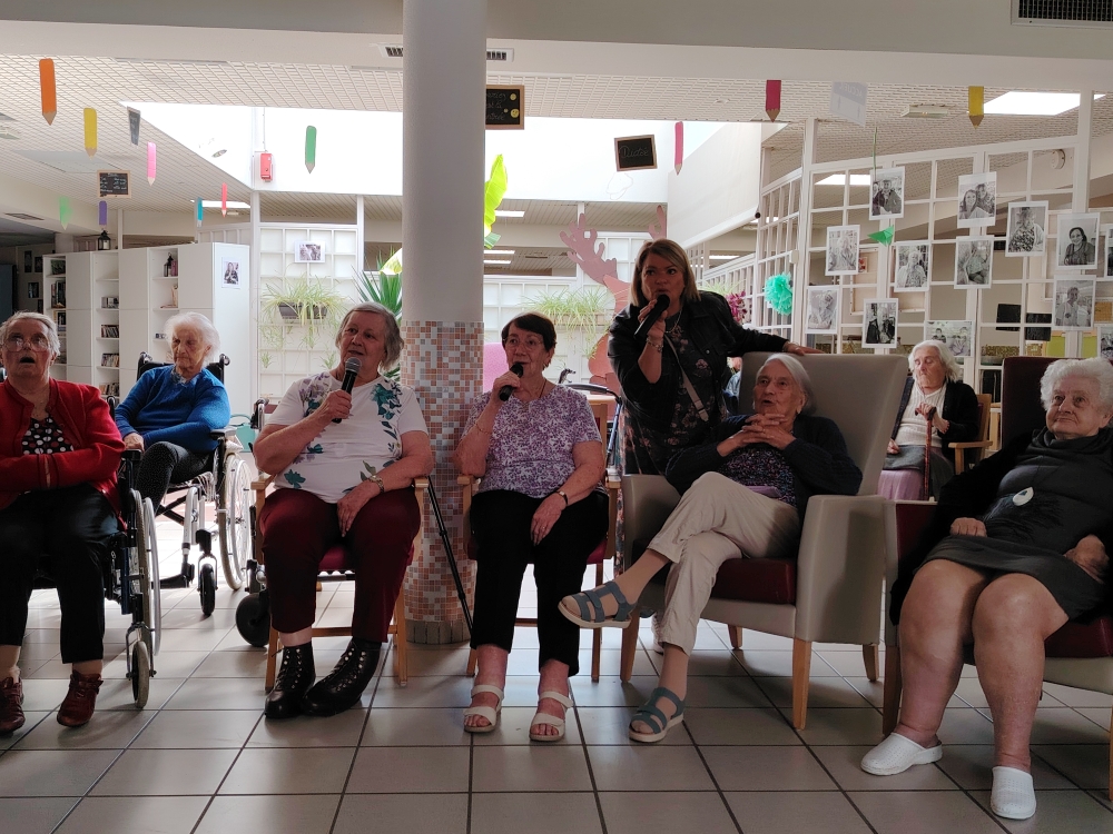 Nous terminons cette semaine sous le signe de la musique ! Séance karaoké, résidents et soignants se sont volontiers prêtés au jeu : micro en main, chacun a fredonné ou chanté, avec enthousiasme, des airs de leur époque mais aussi quelques titres plus récents. Une animation joyeuse et conviviale, qui a parfaitement le dicton : la musique adoucit les mœurs.