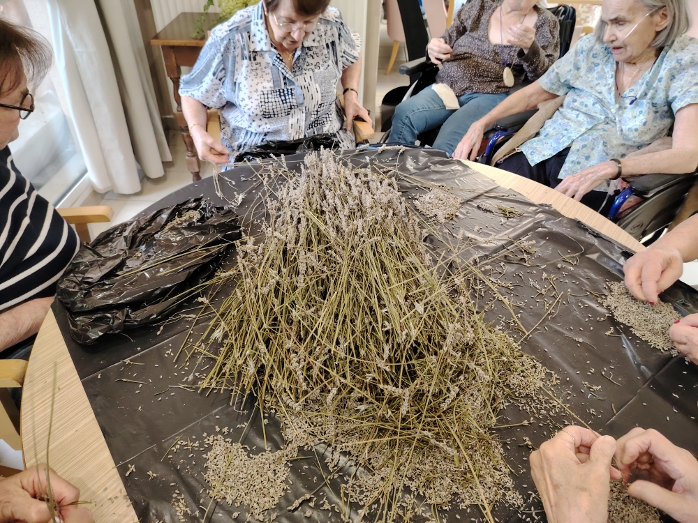 Dans le cadre d’un projet solidaire pour soutenir l’association d’une collègue en faveur de l’école de sa fille, nous avons eu le plaisir de participer à une activité originale : l’aigrénage de la lavande. Ensemble, nous avons séparé les fleurs de leurs tiges afin de confectionner de jolis petits sachets parfumés. L’air embaumait de cette senteur délicate qui rappellera bientôt, dans les armoires, la douceur de l’été. Les résidents se sont investis avec enthousiasme, et l’après-midi a été rythmée par des échanges, des sourire et un fond musical agréable. Un moment simple, chaleureux et convivial, qui a allié solidarité, plaisir des sens et esprit collectif.